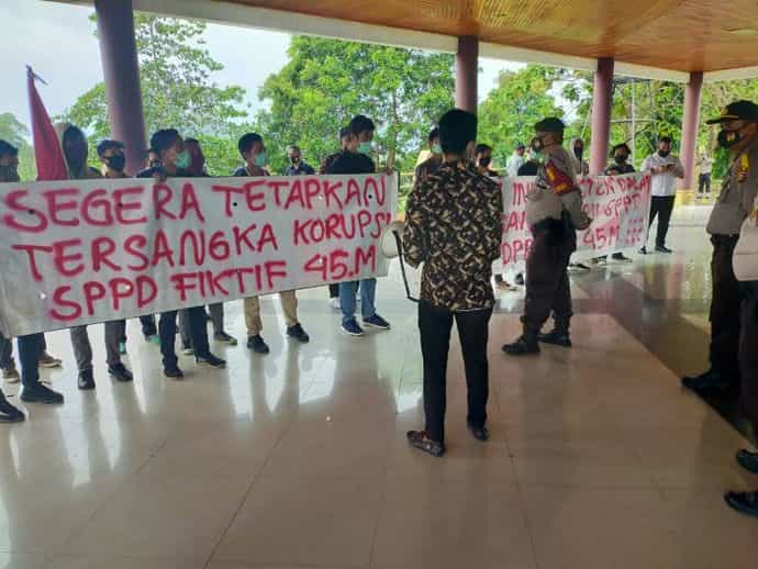 Mahasiswa dari berbagai kampus itu meminta penyidik Polres untuk menetapkan tersangka dugaan korupsi SPPD fiktif di DPRD Kabupaten Inhu menyampaikan orasi mengungganakan pengeras suara di depan gedung Mapolres Inhu d Jalan Ahmad Yani Rengat sekitar pukul 13.45 WIB. Demo mahasiswa terus berjalan, walaupun sempat diguyur hujan.