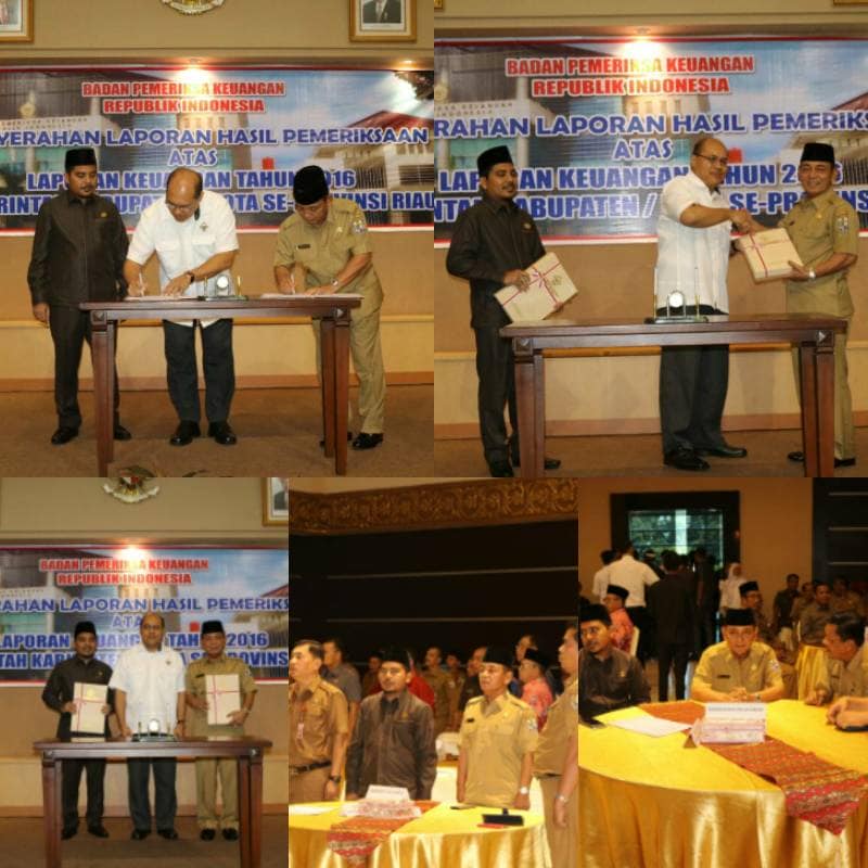 Pekanbaru,Riaudetil.com – Pemerintah Kabupaten Pelalawan kembali meraih predikat Opini Wajar Tanpa Pengecualian ( WTP ) murni yang kelima kalinya selama 5 tahun berturut – turut dibawah kepemimpinan Bupati Pelalawan H.M.Harris dan wabup Drs.H.Zardewan,MM diperiode kedua kepemimpinannya atas Laporan Hasil Pemeriksaan Keuangan Pemerintah Daerah Kabupaten Pelalawan Tahun 2016.Acara berlangsung di ruang Auditorium Kantor BPK Perwakilan Riau Pekanbaru. Senin (12/06/2017).