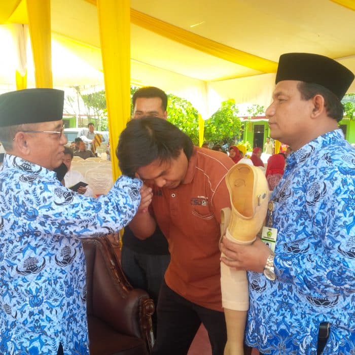 RIAU DETIL.COM,PELALAWAN-Ketua Umum Baznas Kabupaten Pelalawan HM Harris didampingi Sekretaris Umum Baznas HM.Rais M.Pdi serahkan bantuan tangan palsu kepada Jasman warga Bandar Petalangan, Senin (3/10/2016). Penyerahan tangan palsu ini disaksikan pihak DPRD Pelalawan, pimpinan SKPD, Camat, dan Masyarakat.