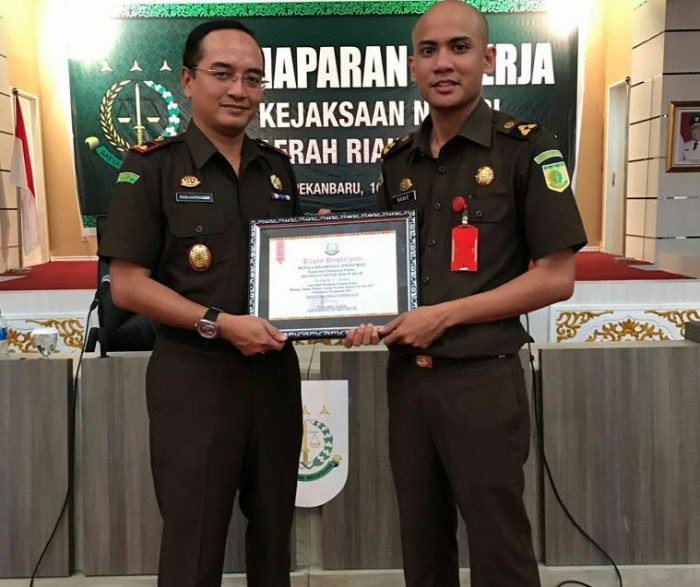 Penyerahan piagam langsung dilakukan oleh Kepala Kejaksaan Tinggi (Kajati) Riau Uung Abdul Syakur, SH, MH , Kamis (10/8/2017) pekan lalu, di Balai Sirindit, Pekanbaru. Piagam langsung diterima Kajari Rohil Bima Suprayoga, SH, MH dan Kasipidum Kejari Rohil Sobrani Binzar, SH.