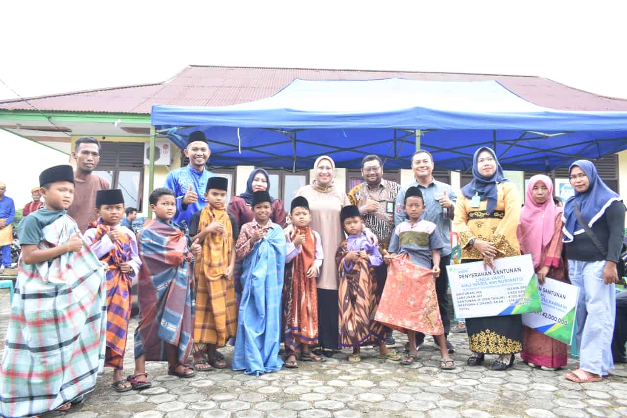 Bupati juga menyerahkan secara simbolis santunan JKM kepada ahli waris almarhum Zulkarnain anggota BPD desa kuantan tenang, dan santunan kepada ahli waris almarhum Surianto karyawan PT. Kharisma Riau Sentosa Prima.