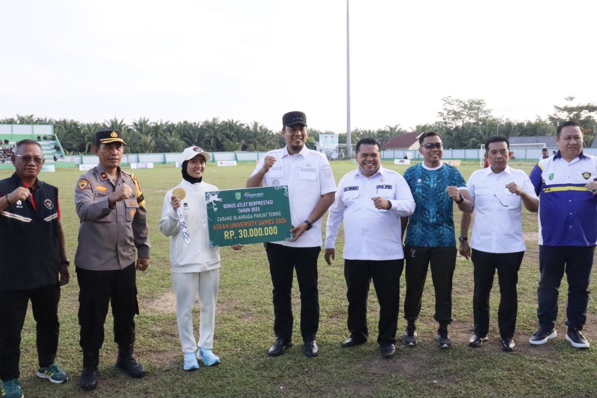 Dalam kesempatan tersebut, Bupati Ade Agus Hartanto menyerahkan secara simbolis bonus bagi atlet dan pelatih berprestasi serta menyerahkan dana hibah Komite Olahraga Nasional Indonesia (KONI) Inhu.
