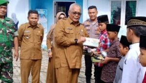 Keterangan Foto : Asisten II Setda Inhu menyerahkan bantuan kepada peserta sunat massal di Kecamatan Sungai Lala, Selasa (16/12/2025)