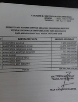 Bantuan Keuangan Provinsi 2018, sepekan terakhir menjadi topik yang cukup hangat dalam setiap pertemuan. Mulai dari bincang bincang di warung kopi, sampai dengan diskusi hangat dimedia sosial. Betapa tidak, berdasarkan Keputusan Gubernur Riau Nomor: Kpts.308/IV/2018, tentang Rekapitulasi Alokasi Bantuan Keuangan Pemerintah Provinsi Riau Kepada Pemerintah Kabupaten/Kota Yang Bersumber Dari APBD Provinsi Riau Tahun Anggaran 2018 tanggal 23 April 2018, ternyata ada empat kabupaten/kota yang tidak mendapatkan Bankeu Pemprov Riau 2018, yaitu Kabupaten Bengkalis, Kabupaten Pelalawan, Kabupaten Rokan Hilir dan Kota Pekanbaru.