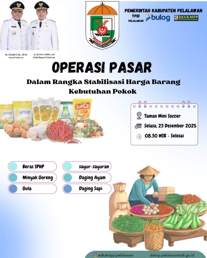 Pelalawan, riaudetil.com – Pemerintah Kabupaten Pelalawan melalui Dinas Koperasi Usaha Kecil dan Menengah Perindustrian dan Perdagangan (Diskop UKM Perindag) dijadwalkan besok Selasa (23/12/2025) mulai pukul 08.30 wib menggelar operasi pasar murah bertempat di taman mini soccer Pangkalan Kerinci.