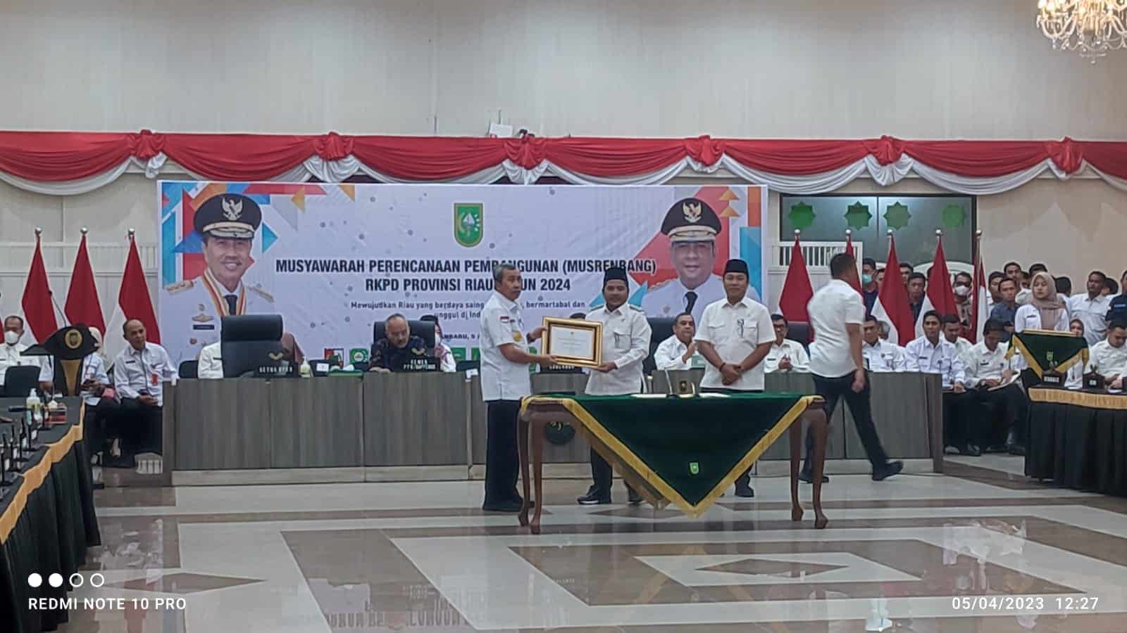 Penghargaan diserahkan langsung oleh Gubernur Riau H. Syamsuar, M.Si kepada Wakil Bupati Pelalawan H.Nasaruddin, SH, MH pada acara Musrenbang RKPD Propinsi Riau Tahun 2024.