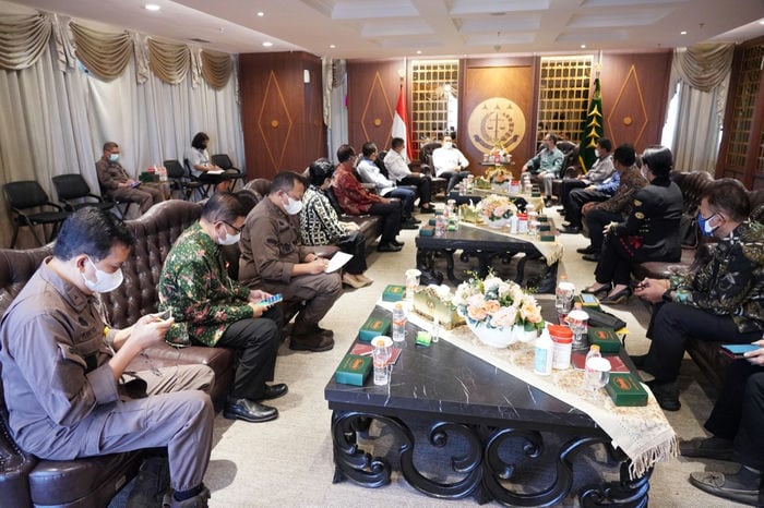 RIAUDETIL.COM, JAKARTA – Bertempat di Lantai 10 Gedung Menara Kartika, Jaksa Agung Burhanuddin didampingi oleh Jaksa Agung Muda Tindak Pidana Umum (JAM-Pidum) Fadil Zumhana, Jaksa Agung Muda Tindak Pidana Khusus (JAM-Pidsus) Febrie Adriansyah, Kepala Pusat Penerangan Hukum Ketut Sumedana, Asisten Umum Jaksa Agung Kuntadi, dan Asisten Khusus Jaksa Agung Hendro Dewanto menerima kunjungan silaturahmi Ketua Dewan Komisioner (DK) Otoritas Jasa Keuangan (OJK) Mahendra Siregar beserta jajaran, Kamis (4/8/2022).